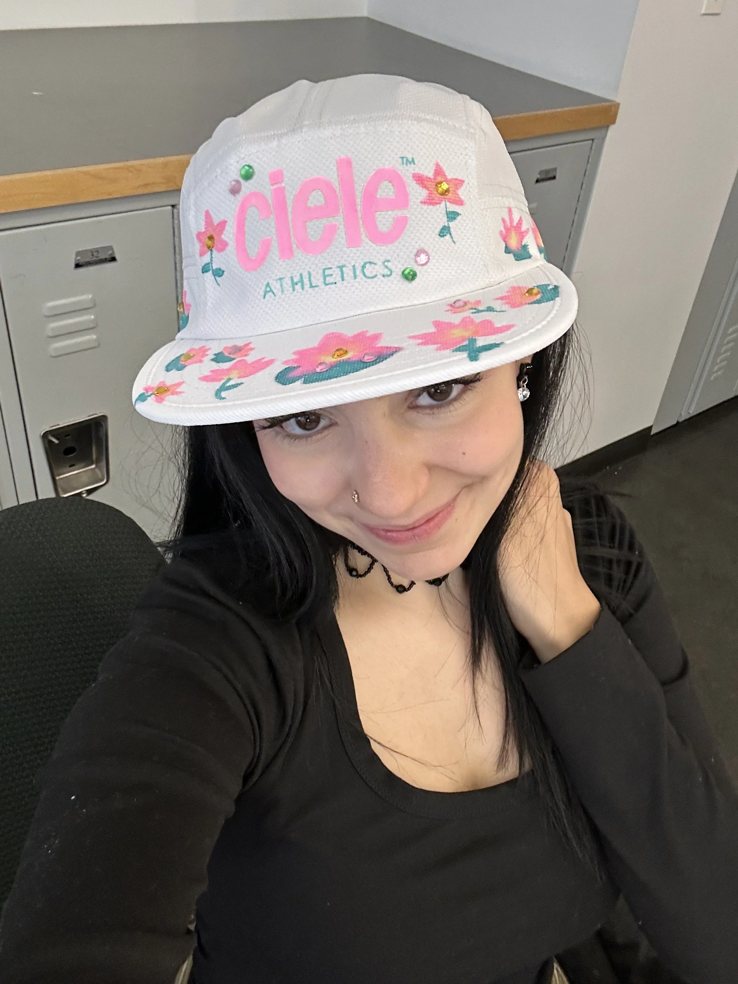 As a graphic design student at the University of the Arts, I was invited to join an apparel design workshop led by Mural Miles, a Philadelphia-based nonprofit supporting emerging artists, in collaboration with athletic brand Ciele. We were challenged to transform blank running hats into wearable art, each reflecting our unique style. My design was inspired by my middle name, “Luxmi” — another name for the Hindu Goddess of prosperity, who is closely associated with the lotus flower. I’ve long felt a personal connection to the symbolism of the flower, and this project gave me a chance to honor that connection